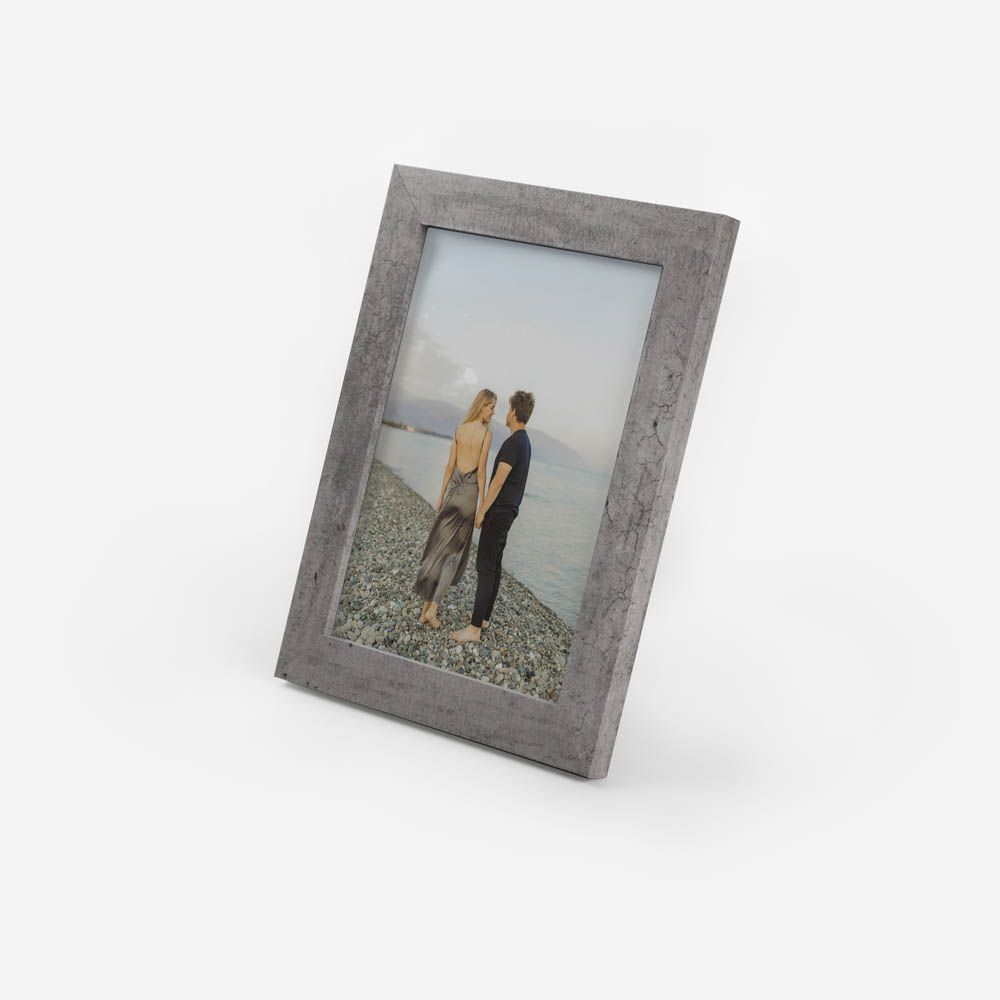 Moldura de alta qualidade, fabricada num material com aspeto concreto, garantindo durabilidade e um acabamento perfeito para destacar as tuas fotos.